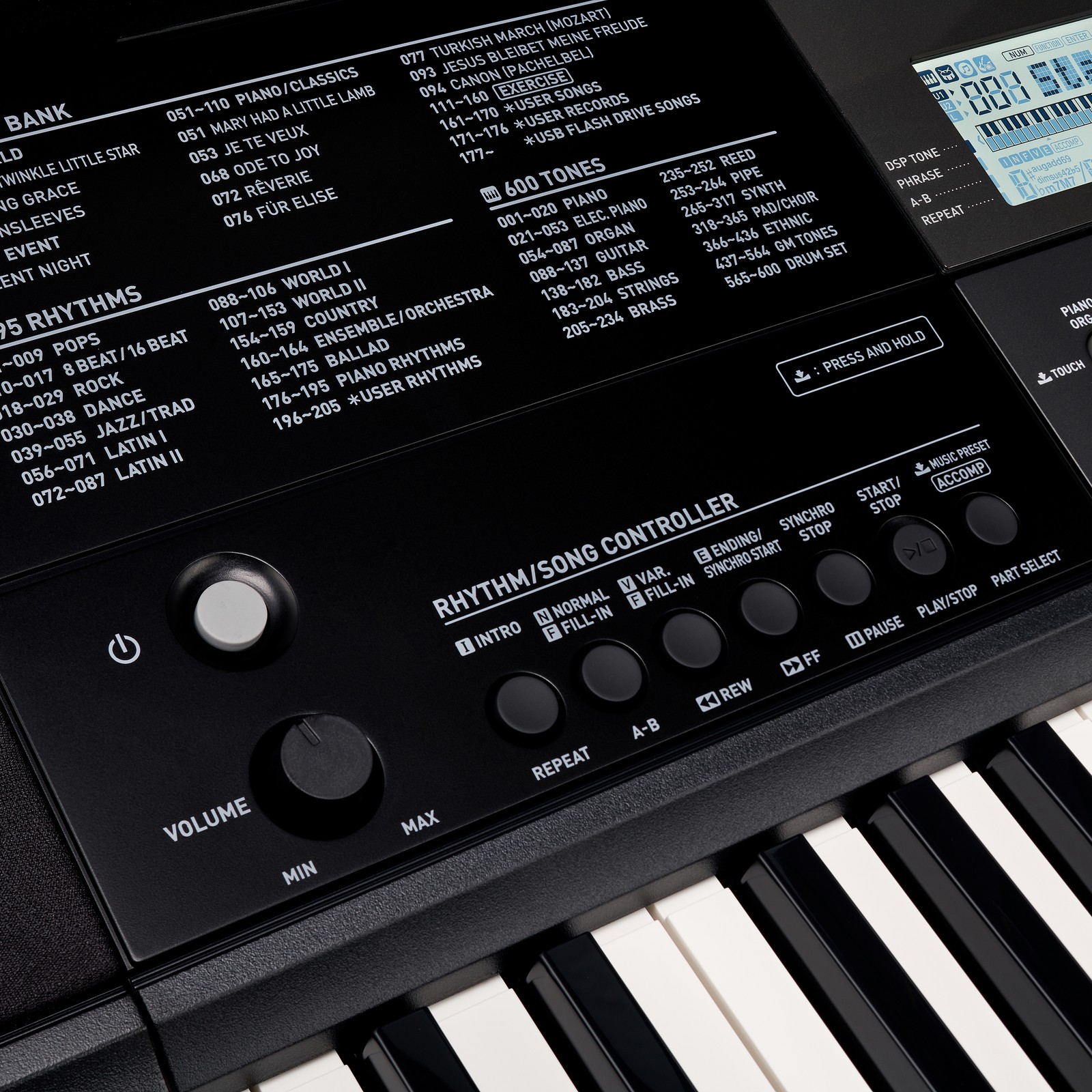 Une chose est claire : le CT-X800 de Casio propose des sonorités prêtes-à-jouer, ainsi que les modes « layer » et « split ». La polyphonie est de 48 voix. Au-delà de ça, le CT-X800 offre de nombreuses possibilités d’apprentissage. Les 160 titres contenus dans la bibliothèque peuvent être travaillés progressivement avec l’aide d’un professeur. On peut charger d’autres morceaux dans l’instrument sous forme de données MIDI. Le CT-X800 propose 600 sonorités internes, 195 styles d’accompagnement et 20 types de réverbes, tout comme 310 presets musicaux. La molette de pitch-bend permet de faire glisser la hauteur du son vers le haut ou vers le bas. L’instrument peut être simplement posé sur le support réglable en hauteur de 50 à 92cm, et connecté au secteur via un transformateur. Tout est alors prêt pour diffuser le son, mis en valeur par les deux haut-parleurs intégrés de 2,5 Watts. On peut également utiliser des piles. Le pupitre est retirable. Pour s’entraîner à la maison sans déranger les voisins, on peut utiliser le casque livré avec. La connectique inclut également deux ports USB – respectivement de type A et de type B – ainsi qu’une entrée pour une pédale et une autre pour un signal audio externe.