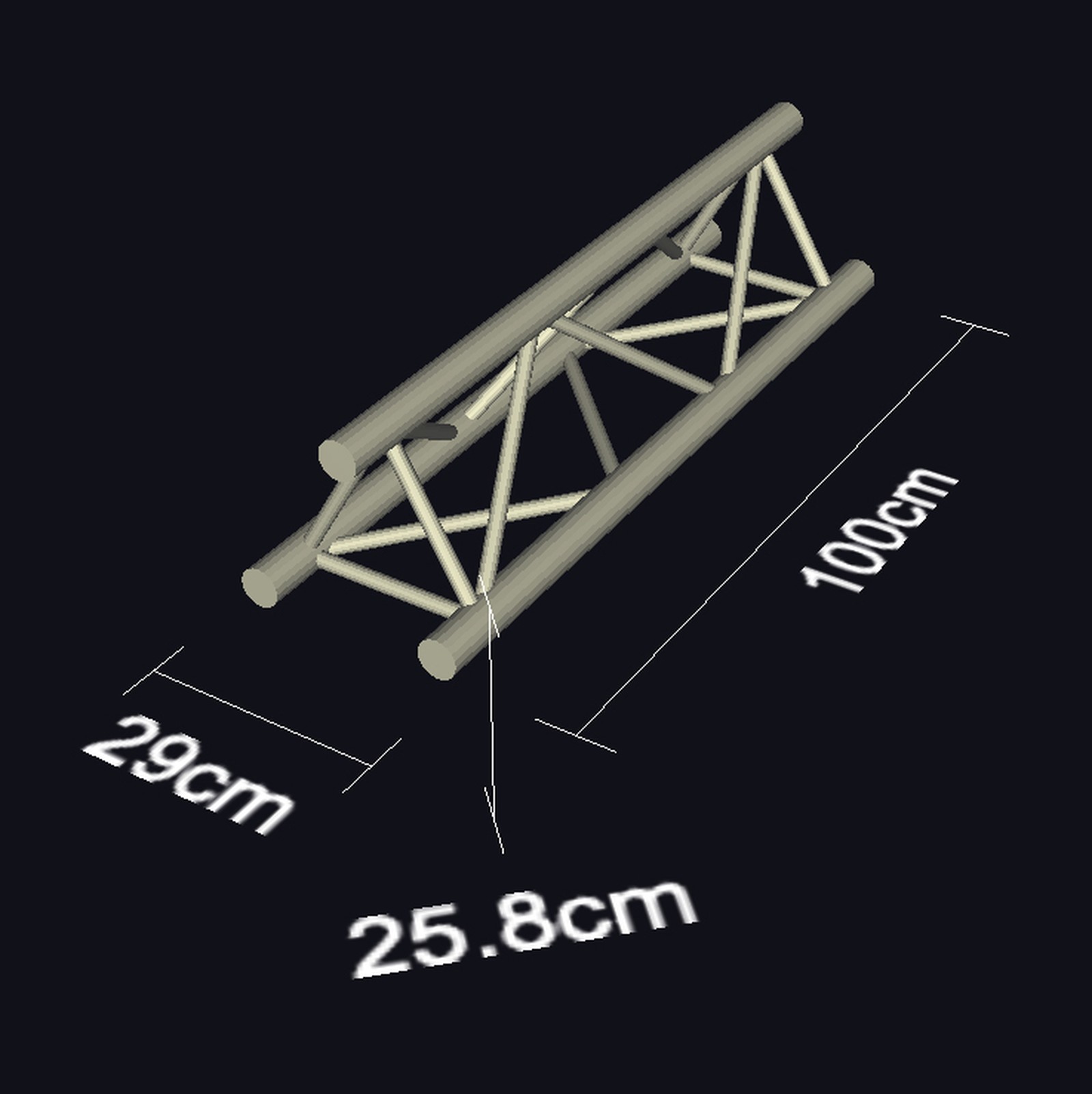 Le système de traverses F33 de Global Truss est un système à 3 points validé par le TÜV (Technischer Überwachungsverein, le principal organisme de certification allemand, note du traducteur). L’ensemble regroupe des tubes porteurs d’un diamètre de 50mm et des contreventements diagonaux d’un diamètre de 20mm, pour une épaisseur de 2mm. Les modules sont en aluminium et s’ajustent les uns aux autres grâce à un ensemble d’éléments coniques que l’on insère à l’aide d’un marteau en cuivre. Malgré sa grande légèreté, le système est prévu pour être établi sur une envergure de 18m. On notera toutefois que le système ne peut pas être chargé de la même manière selon l’envergure choisie : pour une envergure de 10m, la charge concentrée maximale pourra être de 170kg pour une suspension centrale et de 126kg pour les suspensions à 1/3 ou 2/3 de la barre. Si on réduit l’envergure à 4m, la charge concentrée centrale peut aller jusqu’à 438kg.