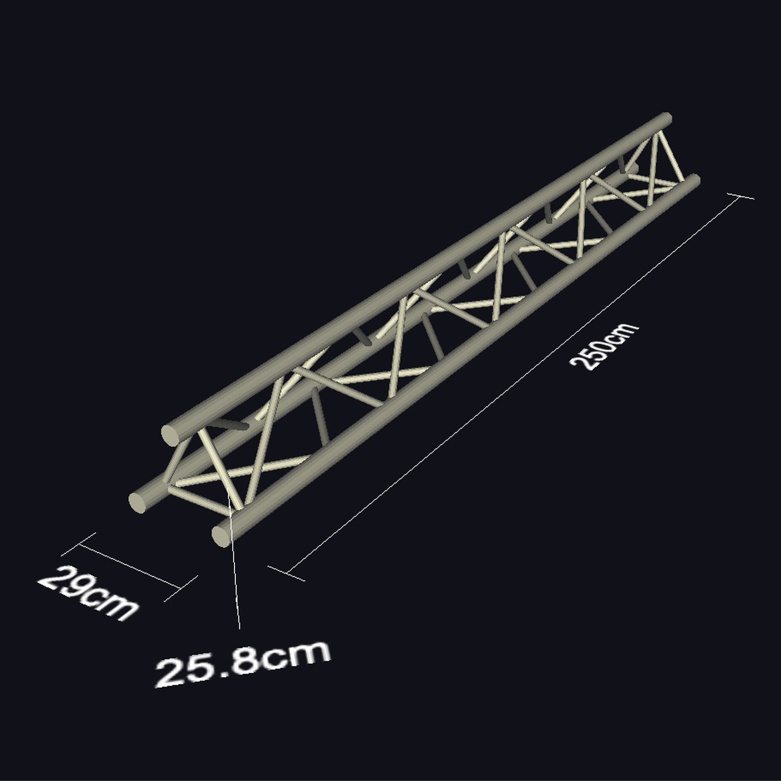 Le système de traverses F33 de Global Truss est un système à 3 points validé par le TÜV (Technischer Überwachungsverein, le principal organisme de certification allemand, note du traducteur). L’ensemble regroupe des tubes porteurs d’un diamètre de 50mm et des contreventements diagonaux d’un diamètre de 20mm, pour une épaisseur de 2mm. Les modules sont en aluminium et s’ajustent les uns aux autres grâce à un ensemble d’éléments coniques que l’on insère à l’aide d’un marteau en cuivre. Malgré sa grande légèreté, le système est prévu pour être établi sur une envergure de 18m. On notera toutefois que le système ne peut pas être chargé de la même manière selon l’envergure choisie : pour une envergure de 10m, la charge concentrée maximale pourra être de 170kg pour une suspension centrale et de 126kg pour les suspensions à 1/3 ou 2/3 de la barre. Si on réduit l’envergure à 4m, la charge concentrée centrale peut aller jusqu’à 438kg.