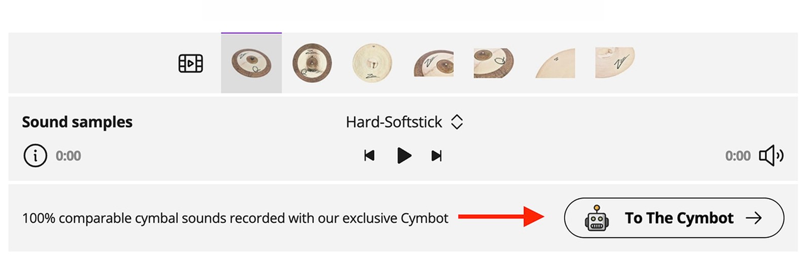 Vas sur la page produit de ta cymbale préférée et clique sur l'icône "Cymbot" en dessous des exemples sonores (voir les captures d'écran ci-dessous).