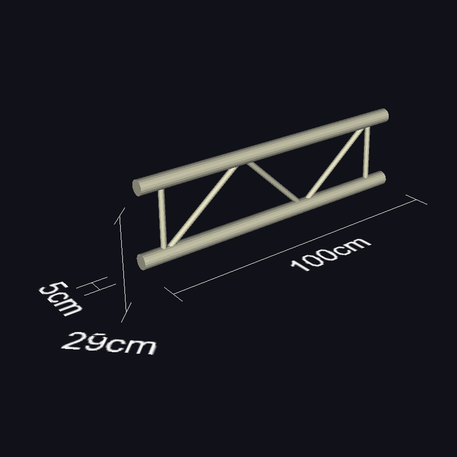 Le système de traverses F32 de Global Truss est un système à 2 points validé par le TÜV (Technischer Überwachungsverein, le principal organisme de certification allemand, note du traducteur). L’ensemble regroupe des tubes porteurs d’un diamètre de 50mm et des contreventements diagonaux d’un diamètre de 20mm, pour une épaisseur de 2mm. Les modules sont en aluminium et s’ajustent les uns aux autres grâce à un ensemble d’éléments coniques que l’on insère à l’aide d’un marteau en cuivre. Malgré sa grande légèreté, le système est prévu pour être établi sur une envergure de 10m. On notera toutefois que le système ne peut pas être chargé de la même manière selon l’envergure choisie. Ainsi, pour une grille d’1m de profondeur pour une envergure de 5m, le poids maximum pour une charge unitaire concentrée au milieu sera 349kg, et de 262kg pour une suspension au 1/3 ou aux 2/3 de la barre. Si on réduit l’envergure à 4m, la charge concentrée centrale pourra monter jusqu’à 439kg.