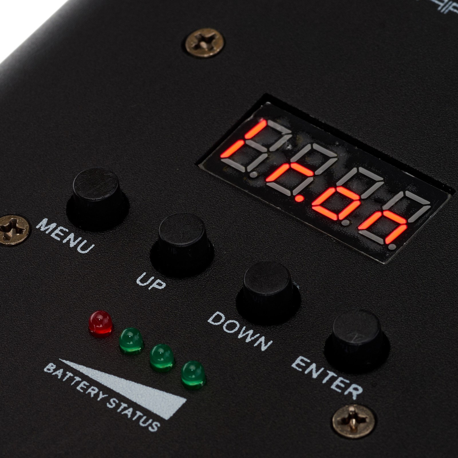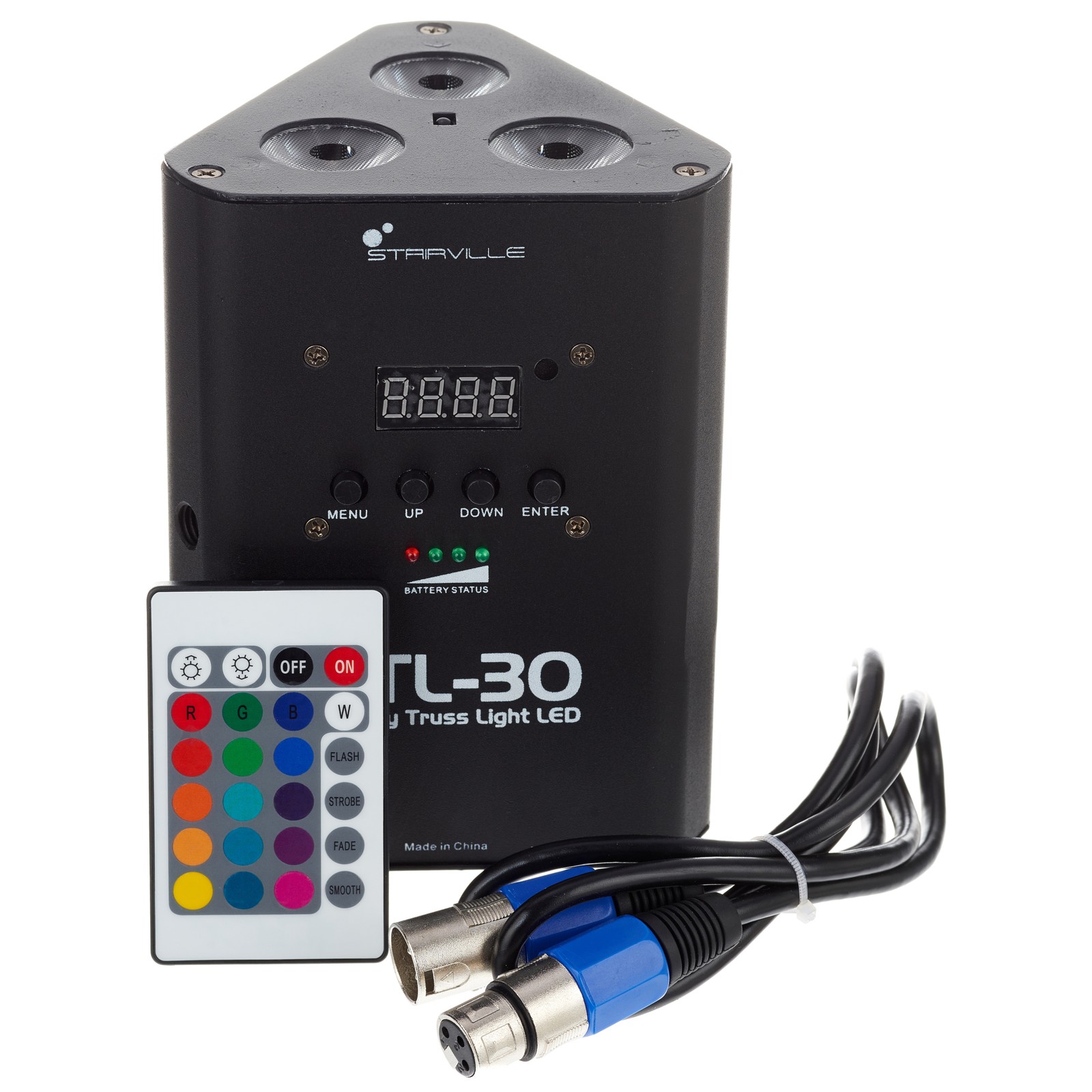Le Stairville BTL-30 Battery Truss Light LED émet la lumière de trois LED RGBW de 10 watts chacune, avec un angle de diffusion de 30°. Cela permet de mélanger toutes les couleurs statiques en utilisant le rouge, le vert, le bleu et le blanc. Les points forts incluent également les programmes de changement de couleur, les fondus, les effets stroboscopiques et le contrôle musical. Plusieurs modes de contrôle sont possibles : par les boutons et un écran sur son boîtier, en utilisant le DMX ou par la télécommande fournie. Cette dernière nécessite une ligne de visée vers le récepteur infrarouge situé entre les lentilles LED. Le projecteur fonctionne grâce à une batterie lithium-ion intégrée qui offre une autonomie de quatre à huit heures selon l'utilisation. La recharge s'effectue avec le câble d'alimentation inclus. Mais le projecteur peut être simplement alimenté en continu avec une alimentation électrique stable.