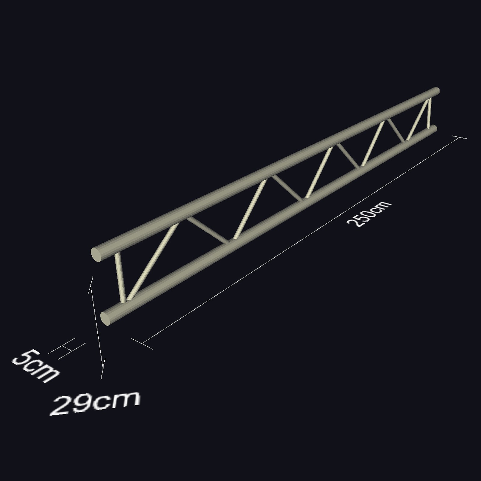 Le système de traverses F32 de Global Truss est un système à 2 points validé par le TÜV (Technischer Überwachungsverein, le principal organisme de certification allemand, note du traducteur). L’ensemble regroupe des tubes porteurs d’un diamètre de 50mm et des contreventements diagonaux d’un diamètre de 20mm, pour une épaisseur de 2mm. Les modules sont en aluminium et s’ajustent les uns aux autres grâce à un ensemble d’éléments coniques que l’on insère à l’aide d’un marteau en cuivre. Malgré sa grande légèreté, le système est prévu pour être établi sur une envergure de 10m. On notera toutefois que le système ne peut pas être chargé de la même manière selon l’envergure choisie. Ainsi, pour une grille d’1m de profondeur pour une envergure de 5m, le poids maximum pour une charge unitaire concentrée au milieu sera 349kg, et de 262kg pour une suspension au 1/3 ou aux 2/3 de la barre. Si on réduit l’envergure à 4m, la charge concentrée centrale pourra monter jusqu’à 439kg.